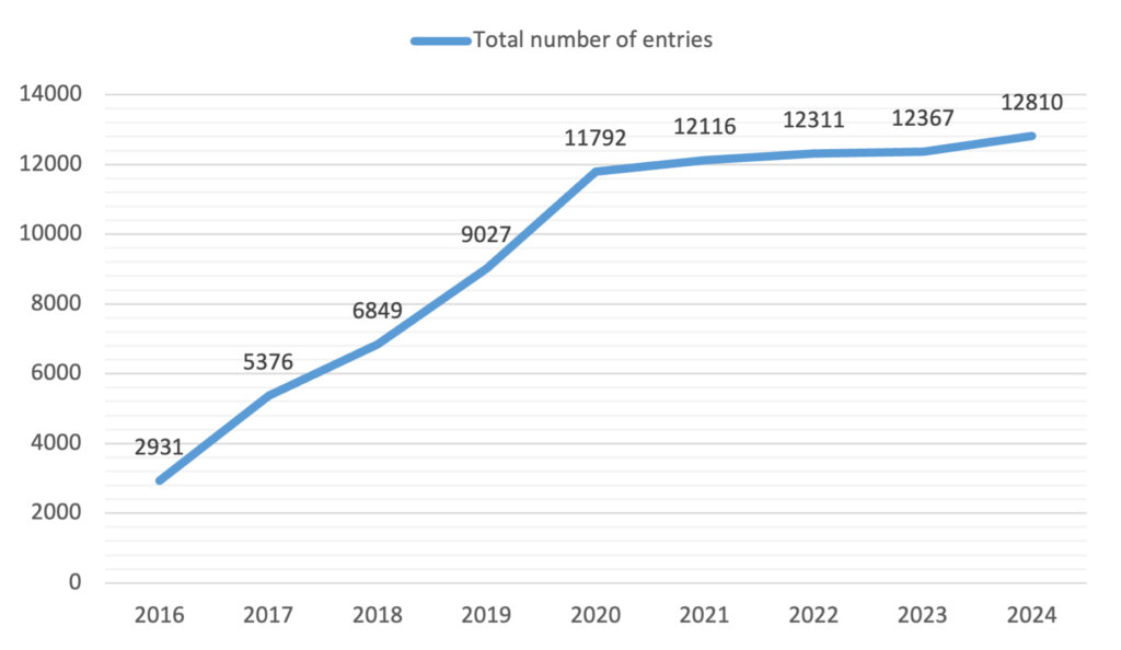 As illustrated in the table and chart below, the total number of Core Maths entries has increased each year, rising from 2,931 in 2016 to 12,810 in the most recent entry figures from 2024.